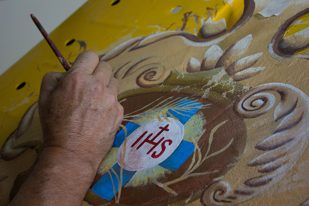 Para conversar com O Semanário, o restaurador pausou o minucioso reparo que exercia numa tela datada de 1928. “Eu trabalho com aerossol, mas o processo que era feito antigamente chamava-se espolvoro. O camarada desenhava numa lona ou num papelão e depois fazia furos contornando o rabisco. Então, era só posicionar o desenho na superfície e ‘bater’ com um pozinho. O desenho saía todo pontilhado”, relata. “Esta foi feita assim”, garante, apontando os pontinhos na antiga tela em sua mesa de desenho. “Ela é tão rústica que tem até areia.”