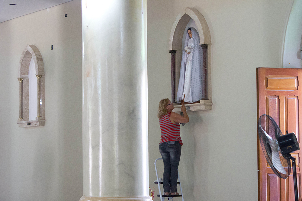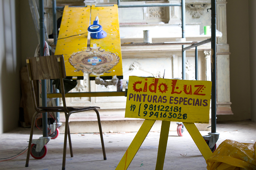 O restaurador Aparecido Luz conta que a parte na qual atua, de restauro do Santíssimo, começou em outubro do ano passado. Trabalhava em casa, com auxílio de uma mesa de desenho, ao mesmo tempo em que outra empresa realizava o serviço de pintura fixa. “Comecei a trabalhar direto no local faz um mês”, comenta.