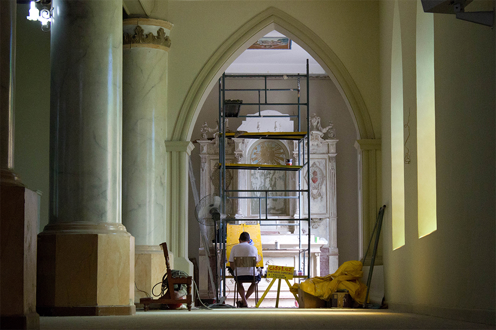 As 25 colunas da igreja serão marmorizadas e lustres estão sendo substituídos por luzes de LED (Foto: Laila Braghero/O Semanário)